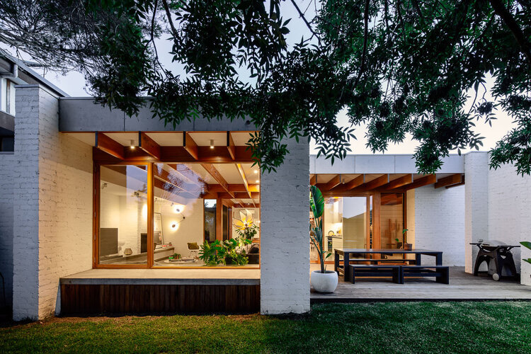 Painted brickwork, hardwood window frames and polished concrete create a raw and robust palette of materials, while the new living areas open out onto a protected deck and the deep backyard with its backdrop of mature eucalypts and moonahs.